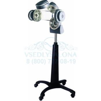 С вентиляцией на кронштейне. Мощность 1110Вт. 10 инфракрасных ламп могут поддерживать 2 режима работы: более/менее мощный. Присутствует таймер. Боковые лампы подвижны. Оснащен двухскоростной вентиляцией. Комплектуется хромированной стойкой с регулировкой по высоте на чёрном пластиковом пятилучье. Цвет серый. Предназначен для ускорения процесса завивки, окраски и лечения волос.