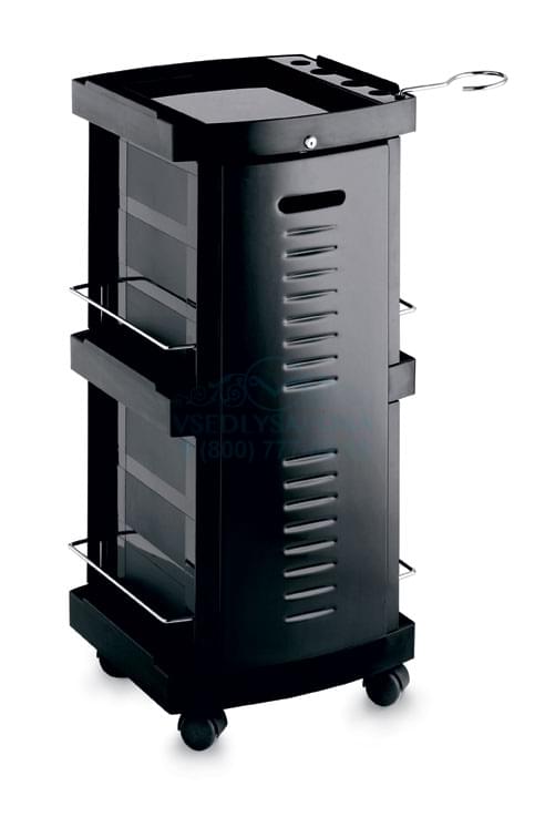 Тележка парикмахерская выполнена из пластика, на колесиках, с выдвижными ящиками и закрывающейся на ключ дверцей. Цвет черный, серый. Размер (ДхШхВ): 39х39х86